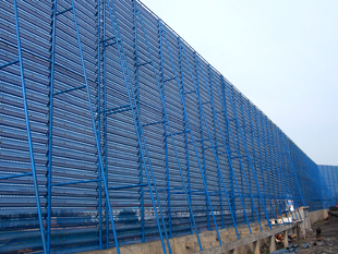 经过我公司近两年对10000吨以上储煤场的现场应用,其综合挡风抑尘墙效果非常显著,单层挡风抑尘墙的综合抑尘效果可达85%以上,双层挡风抑尘墙的综合抑尘效果可达95%左右。挡风抑尘墙设置后不仅使污染严重的地区环境得到有效的改良,而且实施挡风抑尘墙的煤场每年还节省煤数千吨,在取得良好社会效益的同时又获得了很大的经济效益,美观整齐的挡风抑尘墙也成为这些地区一道怡人的风景线!
